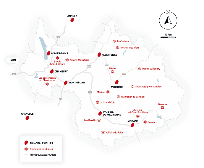Les 14 domaines nordiques de Savoie se répartissent sur l'ensemble du département, dans 5 massifs différents : les Bauges (Savoie Grand Revard), la Chartreuse (Les Entremonts), la Maurienne (les Karellis, Valloire, Bramans Val d'Ambin, Aussois, Bessans, le Grand Coin), la Tarentaise (Pralognan, Champagny, Peisey, Nâves) et le Beaufortain (Arêches Beaufort, Les Saisies)